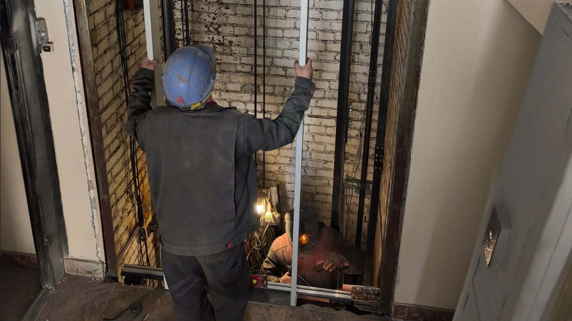 Специалисты монтируют новые направляющие, силовую раму и электрооборудование в шахте. Все работы ведутся в строгом соответствии с проектной документацией и требованиями технической безопасности. Этап проходит под непрерывным контролем прораба.